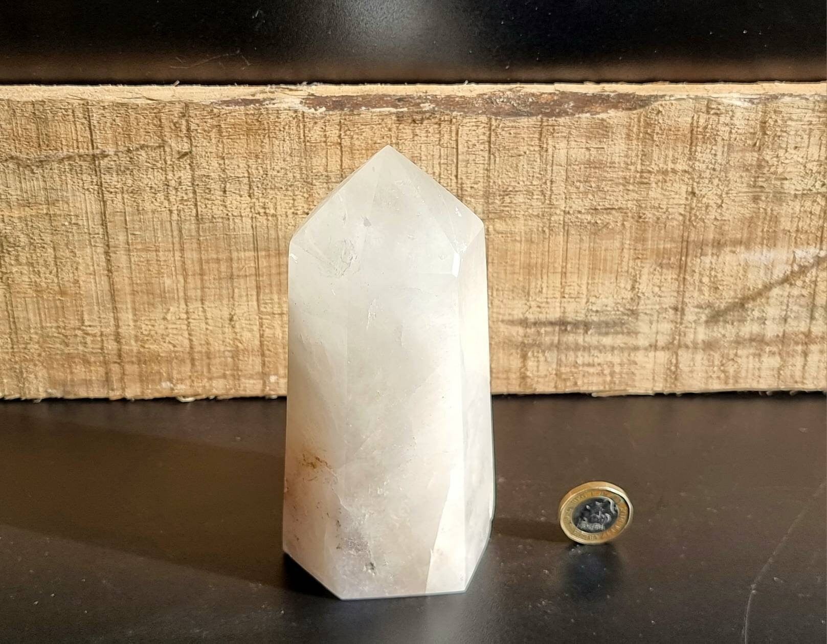 Polished clear Quartz crystal point, from Madagascar Size : 14 x 6.5 cm approx.Quartz is a mineral composed of silicon and oxygen atoms in a continuous framework of SiO4 silicon–oxygen tetrahedra, with each oxygen being shared between two tetrahedra, giving an overall chemical formula of SiO2. Quartz is the second most abundant mineral in Earth's continental crust, behind feldspar.