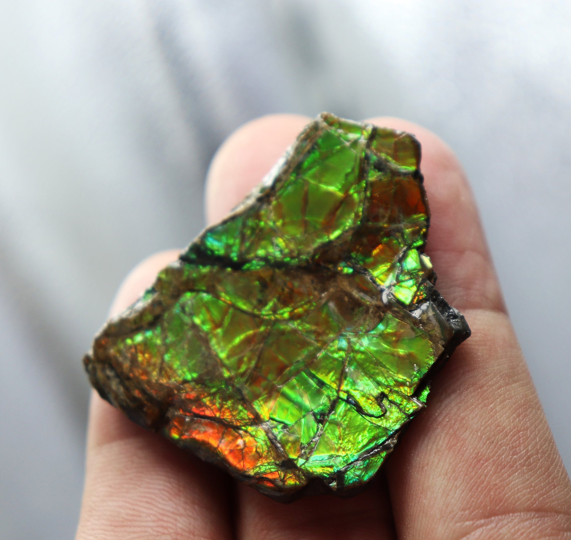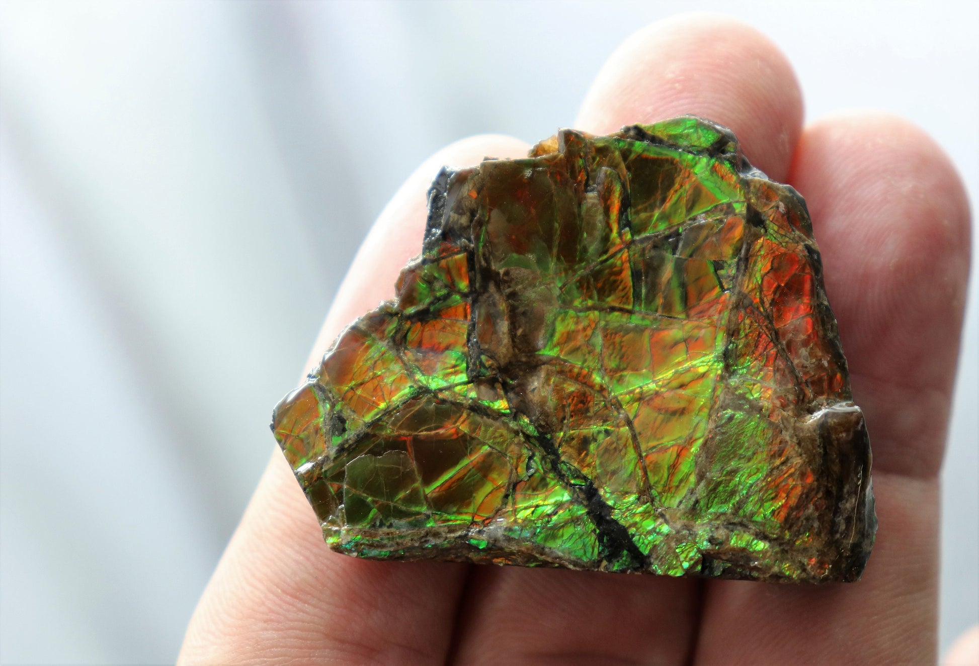 Natural Ammolite Gemstone Size : 4.5 x 1.5 x 3.5 cm approx Location : Canada From the largest active ammolite mine in the world and collected from the banks of the St. Mary's river in southern Alberta, these are natural pieces on original matrix which have been stabilised in resin to protect the fragile nature of the thin Ammolite layer.