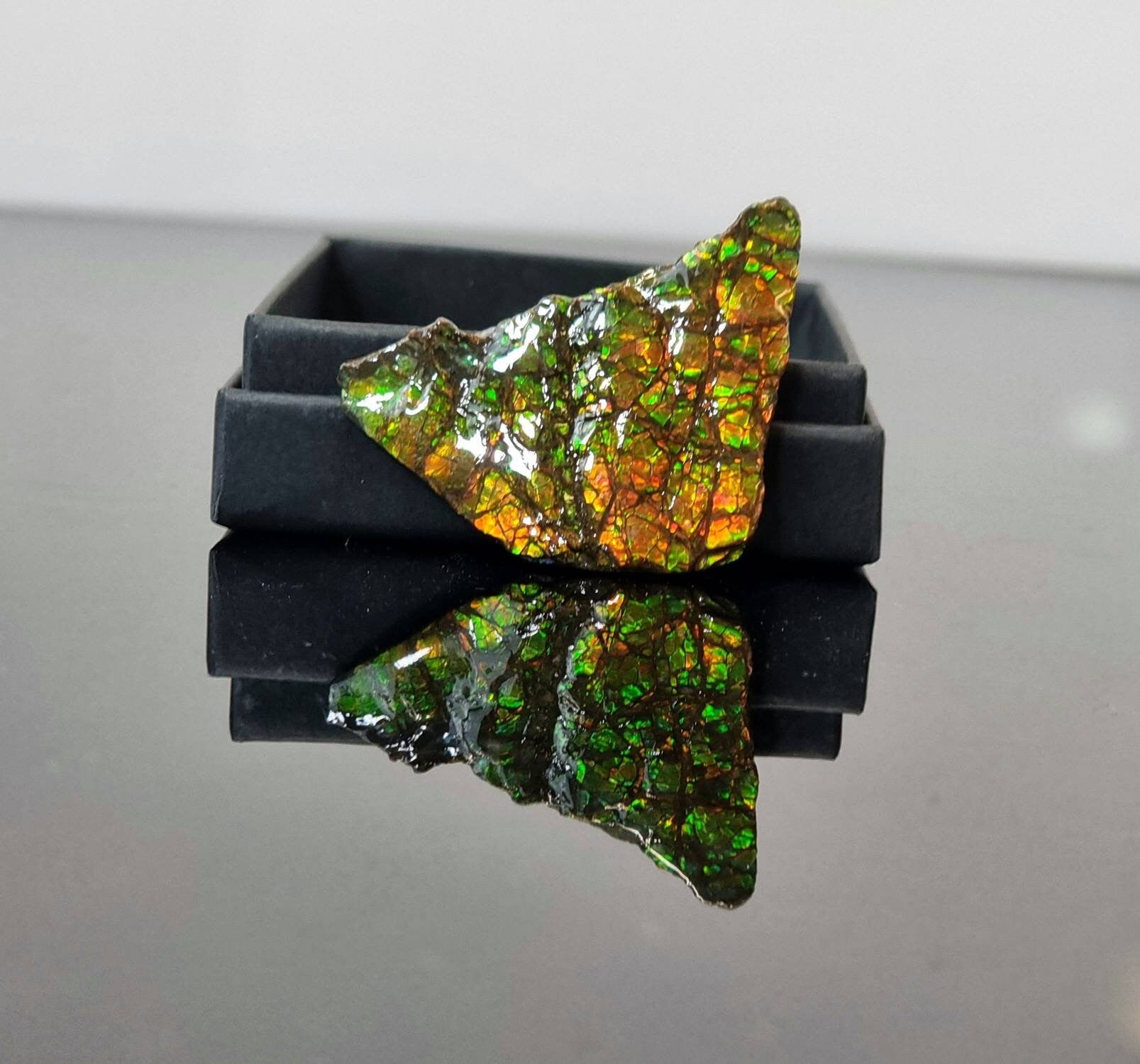 we have a large range of website only pieces available also From the largest active Ammolite mine in the world and collected just east of the Rock Mountains in the upper Bearpaw formation which dates back approximately 71 million years,, these are natural pieces on original matrix which have been stabilised in resin to protect the fragile nature of the thin Ammolite layer. Known as the generation gemstone Ammolite is assured to be mined out in fewer than 20 years making all Ammolite pieces genuinely rare and great collectors pieces.You will receive the exact piece pictured Distinction ~ Excellence that sets someone or something apart from others