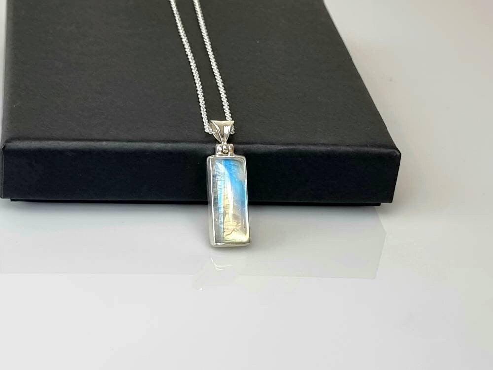 A beautifully set Moonstone Crystal in 925 Silver, Pendant Size : 2.5 x 1 cm approx., not including the claspSilver Chain Length : 18 inchLarge Jewelry Range Available Distinction ~ Excellence that sets someone or something apart from others