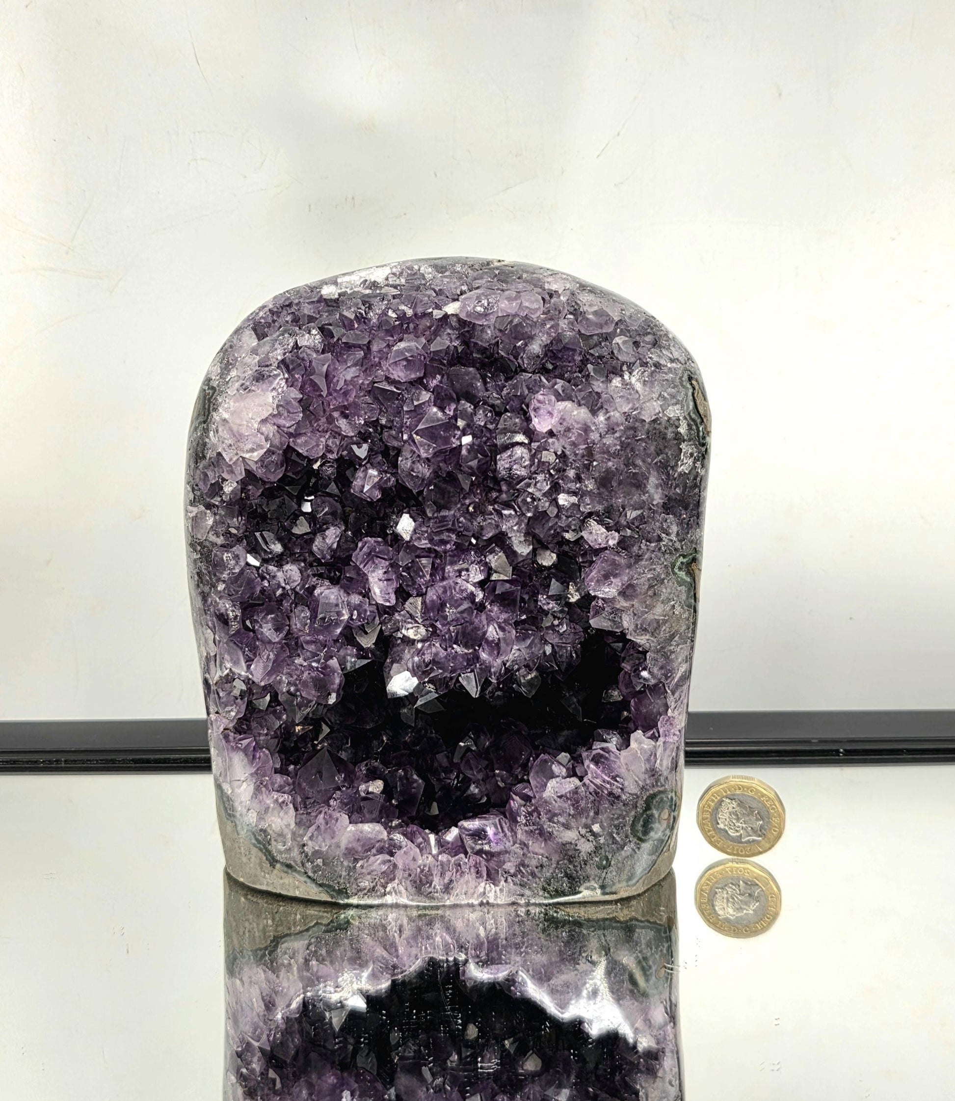 Dark Purple Uruguayan Amethyst Crystal Geode – Cut Base This Uruguayan Amethyst Crystal Geode showcases the exceptional quality and deep coloration that make Uruguay’s amethysts among the most sought-after in the world. With its rich violet hues and naturally sparkling crystal formations, this piece is both elegant and powerful — a true statement specimen for collectors, interior styling, or crystal enthusiasts.Weight: 2.45 kgDimensions: Approx. 16 cm (H) x 12 cm (W) x 7.5 cm (D)Condition: You will receive the exact item shown in the photosEach amethyst geode from Uruguay is unique, displaying distinct crystal formations and color gradients that reflect its geological origin. This specimen combines both aesthetic beauty and natural energy, making it an outstanding addition to any curated crystal collection.