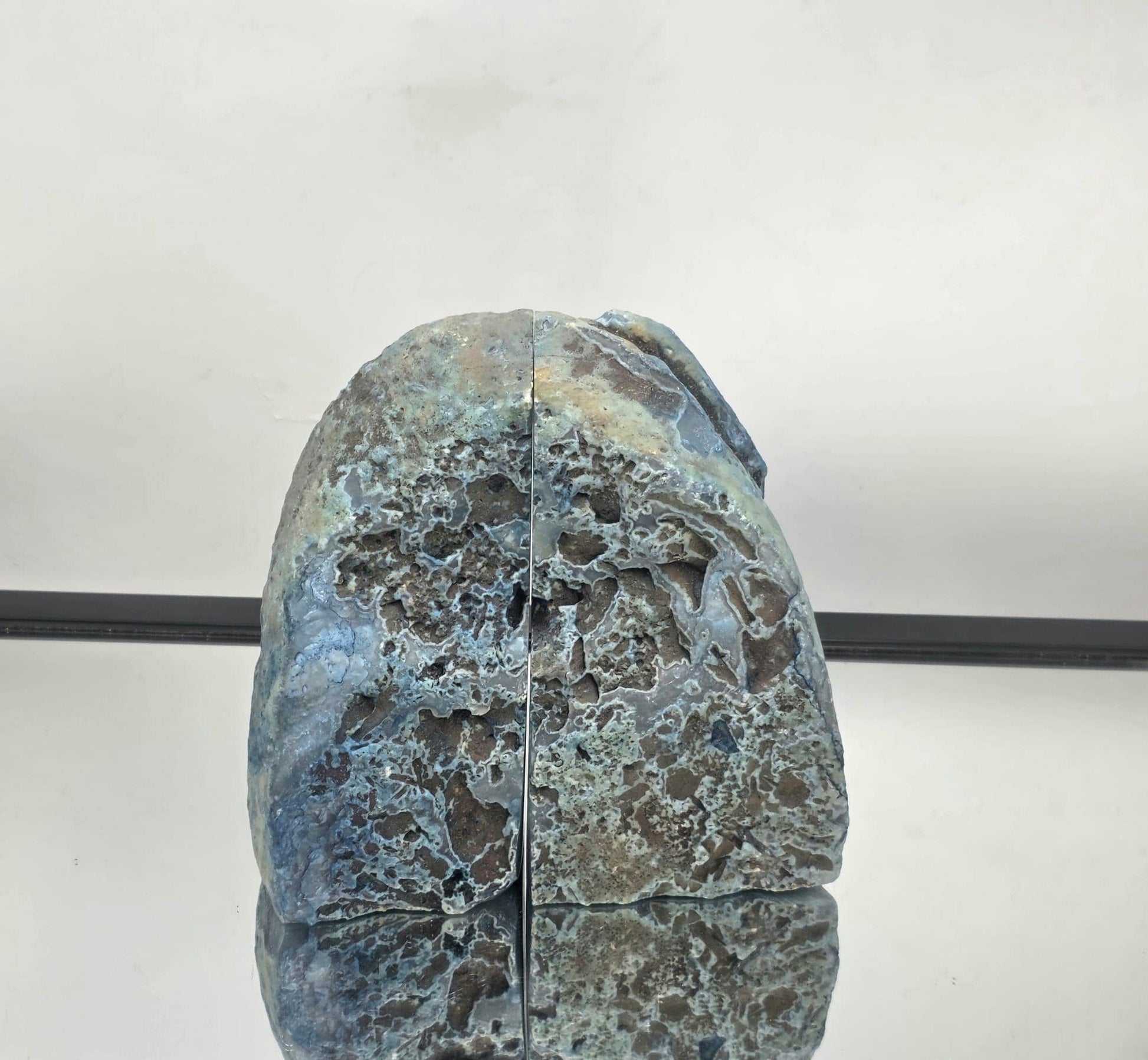 • Size: 16x15x7cm (approx. both pieces together) • Total Weight: 2.88kg (approx. both pieces together) • Origin: Brazil • Finish: Polished front, natural outer edge • Colour: BlueEach pair of bookends are completely unique, showcasing the hypnotic banding and crystalline textures that make agate so endlessly fascinating. These bookends are not only functional but also serve as elegant, eye-catching unique décor for shelves, desks, or console tables.These Agate Geodes go through a dying process to bring out the natural beauty of Agate and offer you truly unique pieces of décor for the home — a process that highlights their natural beauty while preserving their organic structure. The result is a striking decorative feature that pairs perfectly with modern, boho, or minimalist interiors.✨ Metaphysical Insight Agate is widely believed to be a stone of balance, stability, and emotional strength. It’s said to: • Promote courage, calm, and confidence • Ground emotions and ease anxiety or stress • Foster acceptance, patience, and understanding • Support marital and romantic harmony through its harmonizing energyMany also believe agate strengthens the connection between body and earth, helping restore physical and emotional vitality.Whether you’re drawn to their visual beauty, their energy, or both — these Blue Agate Bookends bring serenity, style, and distinction into any space.These are a very popular range and make excellent gifts.Distinction ~ Excellence that sets someone or something apart from others.