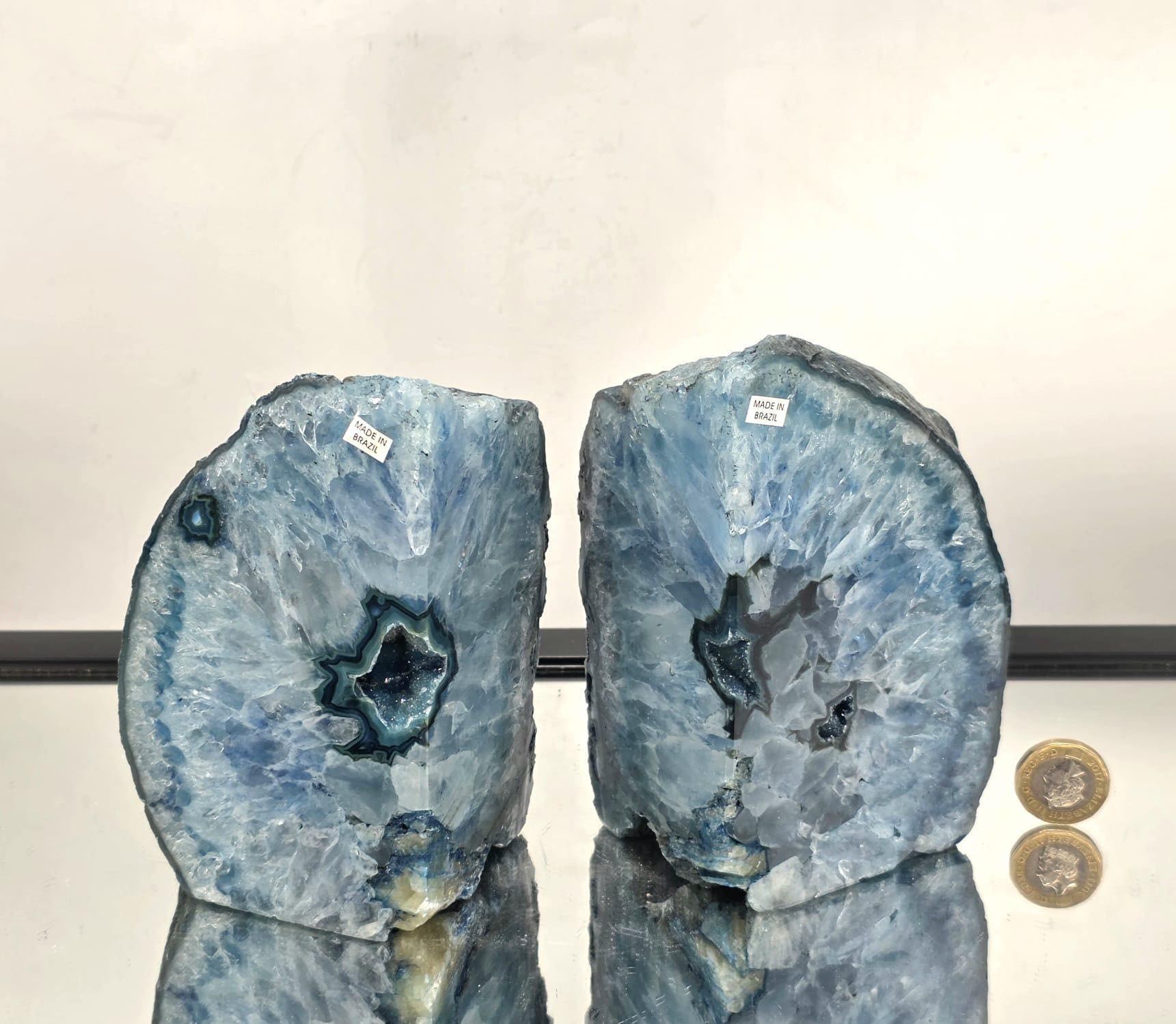 • Size: 17x16x4.5cm (approx. both pieces together) • Total Weight: 3.02kg (approx. both pieces together) • Origin: Brazil • Finish: Polished front, natural outer edge • Colour: BlueEach pair of bookends are completely unique, showcasing the hypnotic banding and crystalline textures that make agate so endlessly fascinating. These bookends are not only functional but also serve as elegant, eye-catching unique décor for shelves, desks, or console tables.These Agate Geodes go through a dying process to bring out the natural beauty of Agate and offer you truly unique pieces of décor for the home — a process that highlights their natural beauty while preserving their organic structure. The result is a striking decorative feature that pairs perfectly with modern, boho, or minimalist interiors.✨ Metaphysical Insight Agate is widely believed to be a stone of balance, stability, and emotional strength. It’s said to: • Promote courage, calm, and confidence • Ground emotions and ease anxiety or stress • Foster acceptance, patience, and understanding • Support marital and romantic harmony through its harmonizing energyMany also believe agate strengthens the connection between body and earth, helping restore physical and emotional vitality.Whether you’re drawn to their visual beauty, their energy, or both — these Blue Agate Bookends bring serenity, style, and distinction into any space.These are a very popular range and make excellent gifts.Distinction ~ Excellence that sets someone or something apart from others.