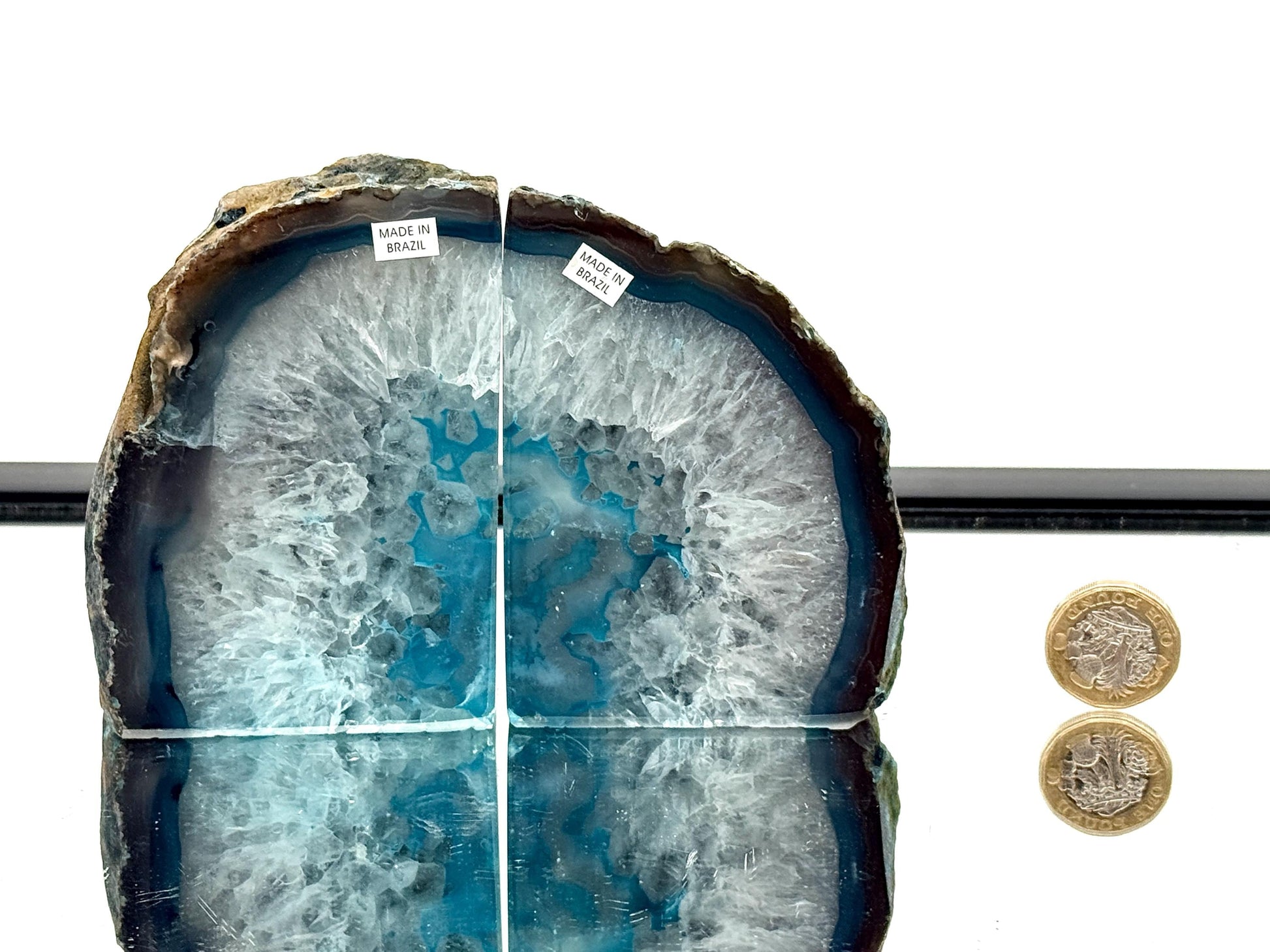 • Size: 9.5 x 13.5 x 4.5 cm (approx. both pieces together) • Total Weight: 0.98 kg (approx. both pieces together) • Origin: Brazil • Finish: Polished front, natural outer edge • Colour: BlueEach pair of bookends are completely unique, showcasing the hypnotic banding and crystalline textures that make agate so endlessly fascinating. These bookends are not only functional but also serve as elegant, eye-catching unique décor for shelves, desks, or console tables.These Agate Geodes go through a dying process to bring out the natural beauty of Agate and offer you truly unique pieces of décor for the home — a process that highlights their natural beauty while preserving their organic structure. The result is a striking decorative feature that pairs perfectly with modern, boho, or minimalist interiors.✨ Metaphysical Insight Agate is widely believed to be a stone of balance, stability, and emotional strength. It’s said to: • Promote courage, calm, and confidence • Ground emotions and ease anxiety or stress • Foster acceptance, patience, and understanding • Support marital and romantic harmony through its harmonizing energyMany also believe agate strengthens the connection between body and earth, helping restore physical and emotional vitality.Whether you’re drawn to their visual beauty, their energy, or both — these Blue Agate Bookends bring serenity, style, and distinction into any space.These are a very popular range and make excellent gifts.Distinction ~ Excellence that sets someone or something apart from others.