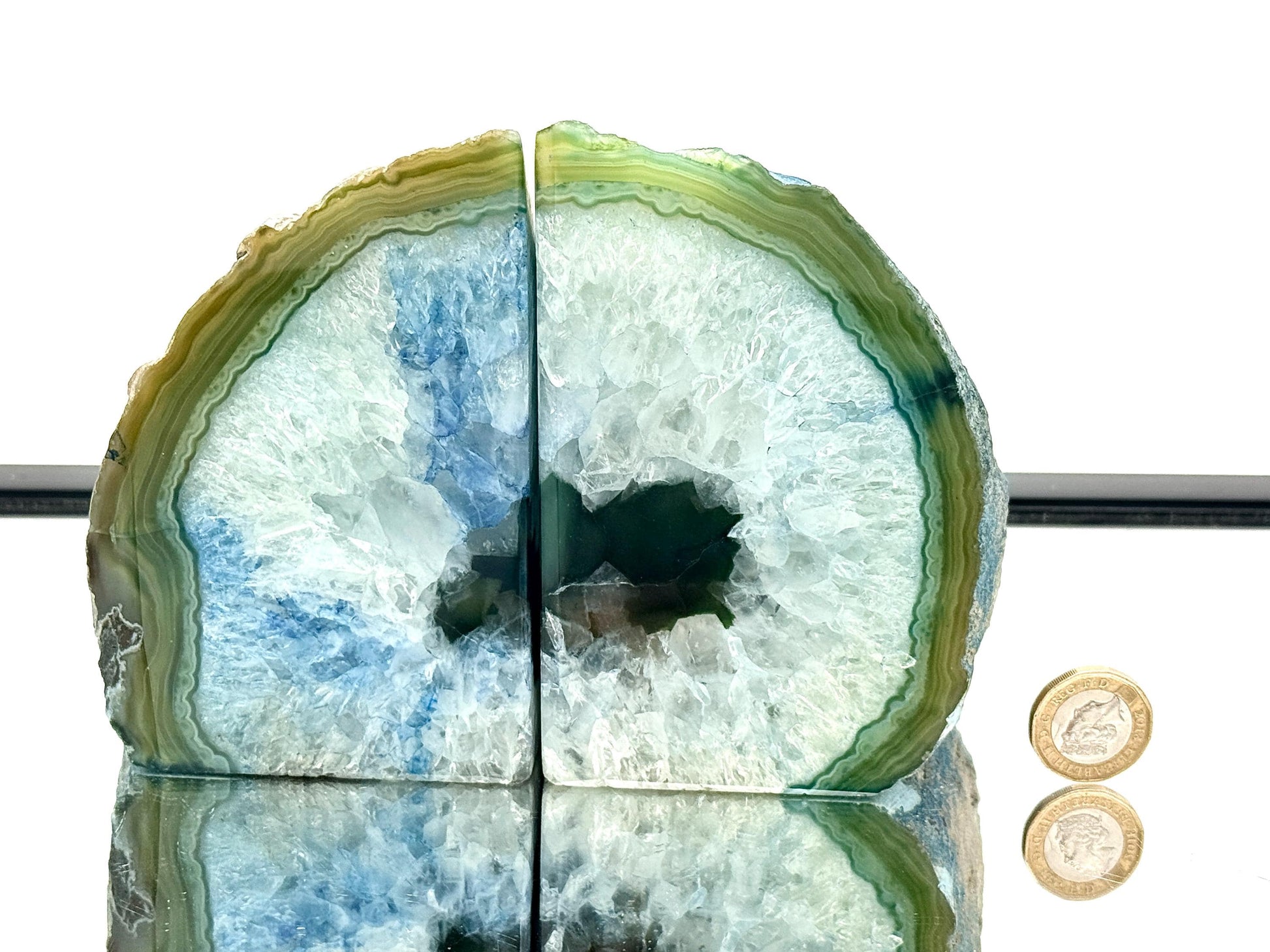 • Size: 12 x 16.5 x 5.5 cm (approx. both pieces together) • Total Weight: 2.04 kg (approx. both pieces together) • Origin: Brazil • Finish: Polished front, natural outer edge • Colour: BlueEach pair of bookends are completely unique, showcasing the hypnotic banding and crystalline textures that make agate so endlessly fascinating. These bookends are not only functional but also serve as elegant, eye-catching unique décor for shelves, desks, or console tables.These Agate Geodes go through a dying process to bring out the natural beauty of Agate and offer you truly unique pieces of décor for the home — a process that highlights their natural beauty while preserving their organic structure. The result is a striking decorative feature that pairs perfectly with modern, boho, or minimalist interiors.✨ Metaphysical Insight Agate is widely believed to be a stone of balance, stability, and emotional strength. It’s said to: • Promote courage, calm, and confidence • Ground emotions and ease anxiety or stress • Foster acceptance, patience, and understanding • Support marital and romantic harmony through its harmonizing energyMany also believe agate strengthens the connection between body and earth, helping restore physical and emotional vitality.Whether you’re drawn to their visual beauty, their energy, or both — these Blue Agate Bookends bring serenity, style, and distinction into any space.These are a very popular range and make excellent gifts.Distinction ~ Excellence that sets someone or something apart from others.