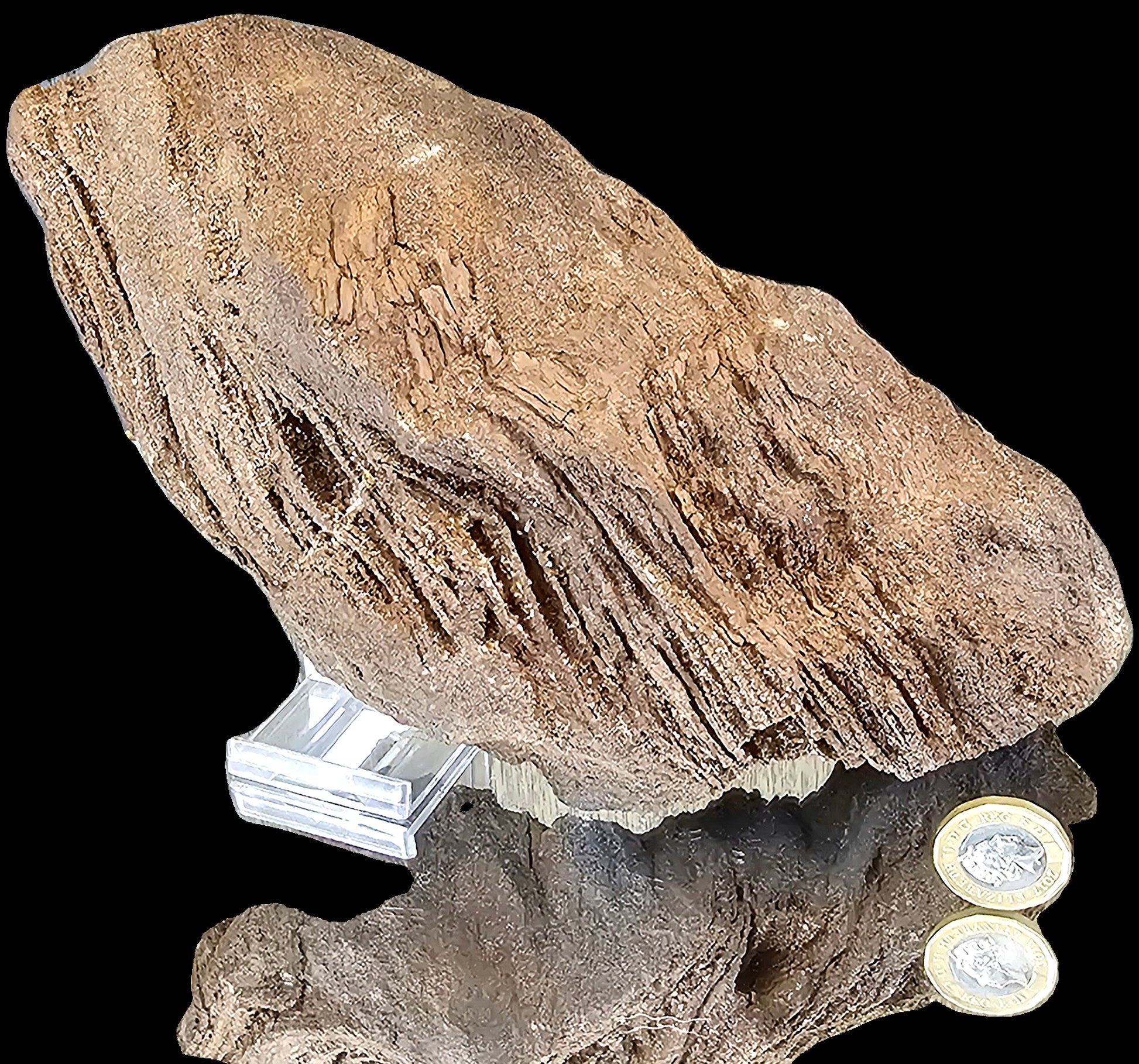 Petrified Wood : Petrified wood (from the Greek root petro meaning "rock" or "stone"; literally "wood turned into stone") is the name given to a special type of fossilized remains of terrestrial vegetation. It is the result of a tree or tree-like plants having completely transitioned to stone by the process of permineralization. All the organic materials have been replaced with minerals (mostly a silicate, such as quartz), while retaining the original structure of the stem tissue. Unlike other types of fossils which are typically impressions or compressions, petrified wood is a three-dimensional representation of the original organic material. The petrifaction process occurs underground, when wood becomes buried under sediment or volcanic ash and is initially preserved due to a lack of oxygen which inhibits aerobic decomposition. Mineral-laden water flowing through the covering material deposits minerals in the plant's cells; as the plant's lignin and cellulose decay, a stone mold forms in its place. The organic matter needs to become petrified before it decomposes completely.[ A forest where such material has petrified becomes known as a petrified forest.