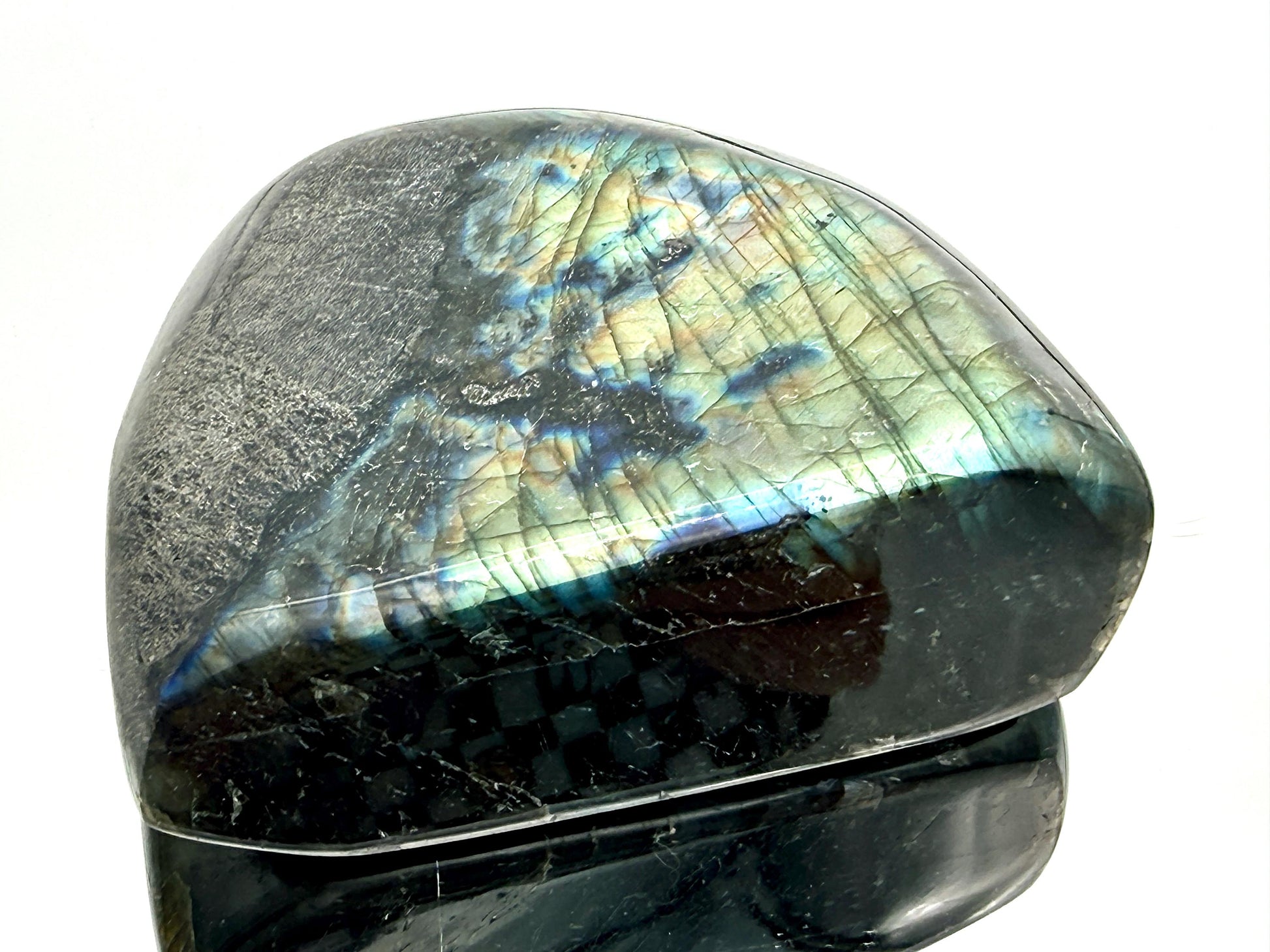 Labradorite crystal fully polished of excellent quality with strong flash Size : H 9.5 x 10 x 3 cm approx.Weight : 0.69kgPhotos taken at best angle to show the natural flashYou will receive the exact piece pictured