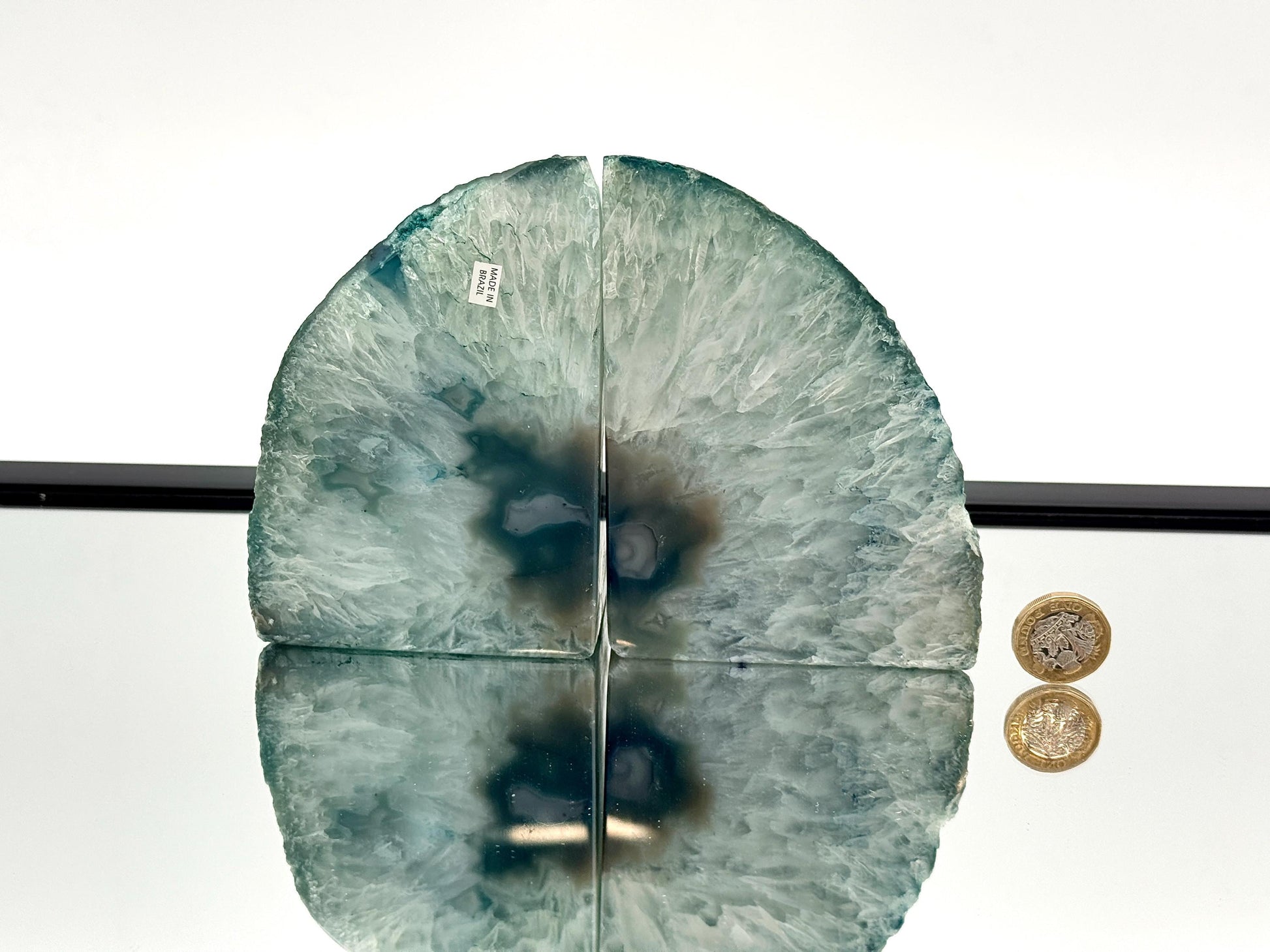• Size: 12.5 x 18 x 6 cm (approx. both pieces together) • Total Weight: 1.69 kg (approx. both pieces together) • Origin: Brazil • Finish: Polished front, natural outer edge and back Each pair of bookends are completely unique, showcasing the hypnotic banding and crystalline textures that make agate so endlessly fascinating. These bookends are not only functional but also serve as elegant, eye-catching unique décor for shelves, desks, or console tables.These Agate Geodes go through a dying process to bring out the natural beauty of Agate and offer you truly unique pieces of décor for the home — a process that highlights their natural beauty while preserving their organic structure. The result is a striking decorative feature that pairs perfectly with modern, boho, or minimalist interiors.✨ Metaphysical Beliefs Agate is widely believed to be a stone of balance, stability, and emotional strength. It’s said to: • Promote courage, calm, and confidence • Ground emotions and ease anxiety or stress • Foster acceptance, patience, and understanding • Support marital and romantic harmony through its harmonizing energyMany also believe agate strengthens the connection between body and earth, helping restore physical and emotional vitality.Whether you’re drawn to their visual beauty, their energy, or both — these Agate Bookends bring serenity, style, and distinction into any space.These are a very popular range and make excellent gifts.Distinction ~ Excellence that sets someone or something apart from others.