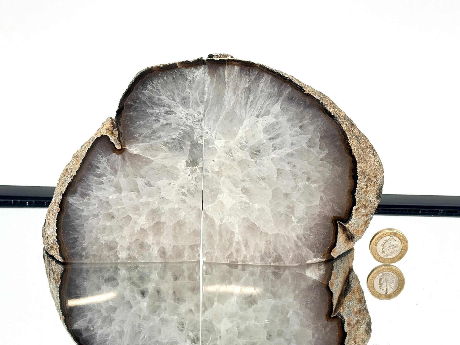 • Size: 12.5 x 20 x 7.5 cm (approx. both pieces together) • Total Weight: 2.34 kg (approx. both pieces together) • Origin: Brazil • Finish: Polished front, natural outer edge and backEach pair of bookends are completely unique, showcasing the hypnotic banding and crystalline textures that make agate so endlessly fascinating. These bookends are not only functional but also serve as elegant, eye-catching unique décor for shelves, desks, or console tables.✨ Metaphysical Beliefs Agate is widely believed to be a stone of balance, stability, and emotional strength. It’s said to: • Promote courage, calm, and confidence • Ground emotions and ease anxiety or stress • Foster acceptance, patience, and understanding • Support marital and romantic harmony through its harmonizing energyMany also believe agate strengthens the connection between body and earth, helping restore physical and emotional vitality.Whether you’re drawn to their visual beauty, their energy, or both — these Agate Bookends bring serenity, style, and distinction into any space.These are a very popular range and make excellent gifts.Distinction ~ Excellence that sets someone or something apart from others.