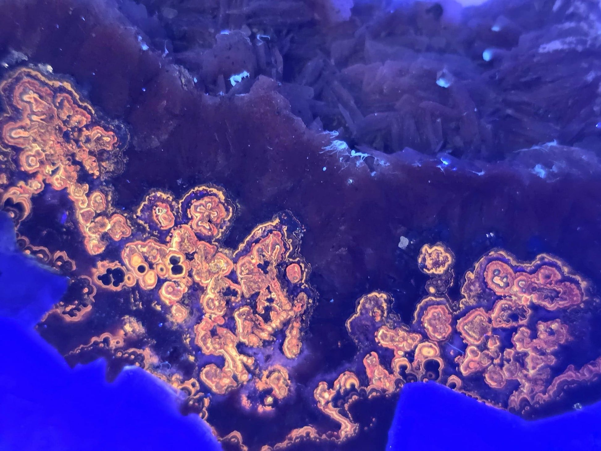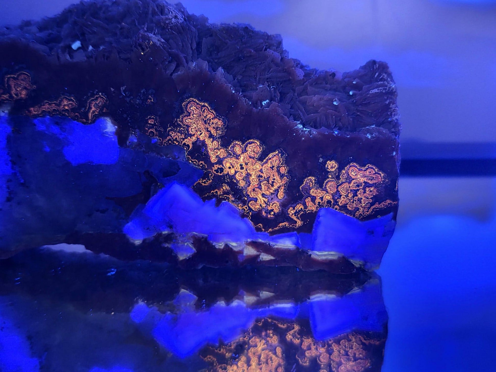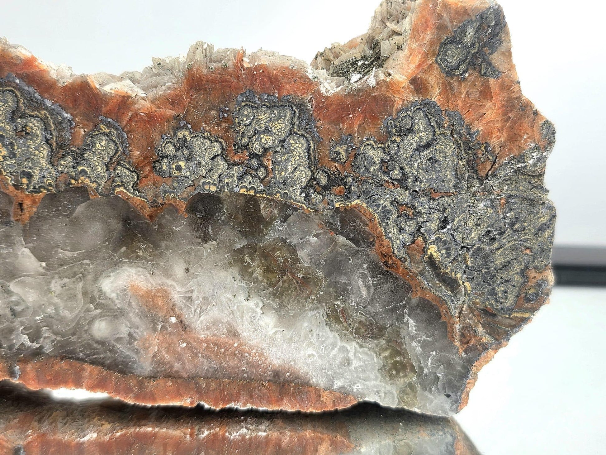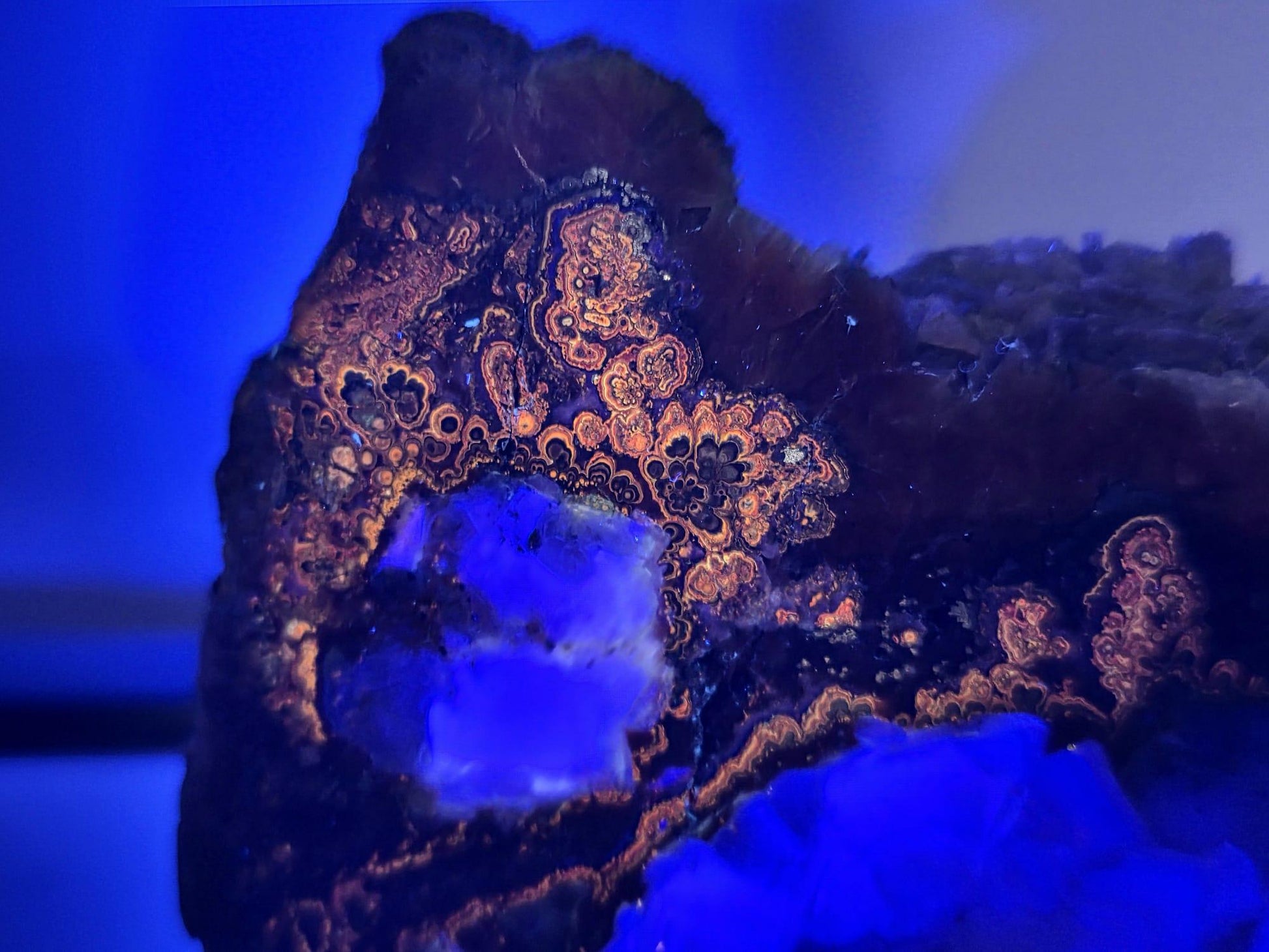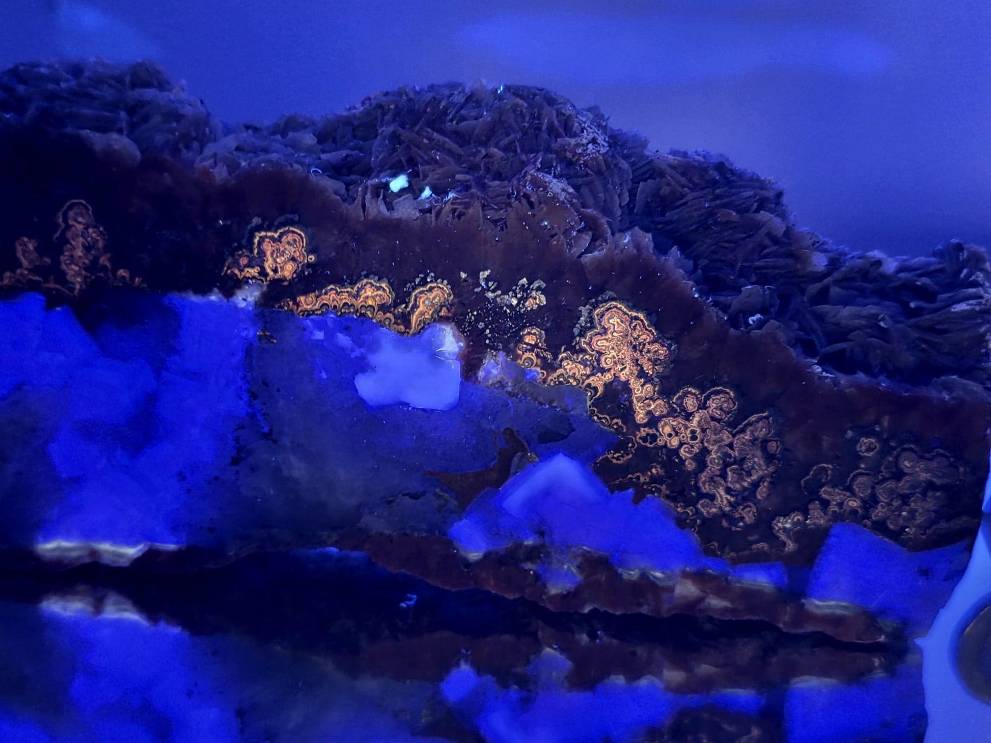 Aouli Imperial Lace BaryteA remarkable specimen from Aouli, Morocco showcasing an exceptionally rare convergence of the district’s most iconic minerals, all naturally intergrown within a single stone.Baryte forms the body of the piece, enriched by zones of fluorite and accented with intricate lace-like patterns of golden pyrite and galena.The galena—Aouli’s signature ore mineral—has partially transformed into delicate lead-oxide phases that glow warmly under UV light, hinting at traces of cerussite.Such a multi-mineral assemblage is highly unusual even for Aouli, where these specimens are typically found separately rather than fused together. The result is a complex, richly textured stone that captures the full mineralogical story of the locality: baryte, fluorite, galena, pyrite, and their vibrant oxidation features, all locked into one dramatic specimen.Size : 19 x 8.5 x 2.5 cm approx Weight : 822gLocation : Morocco This is a true Aouli composite—rare, visually striking, and deeply representative of the mine’s legendary diversity.You will receive the exact piece pictured Distinction ~ Excellence that sets someone or something apart from others