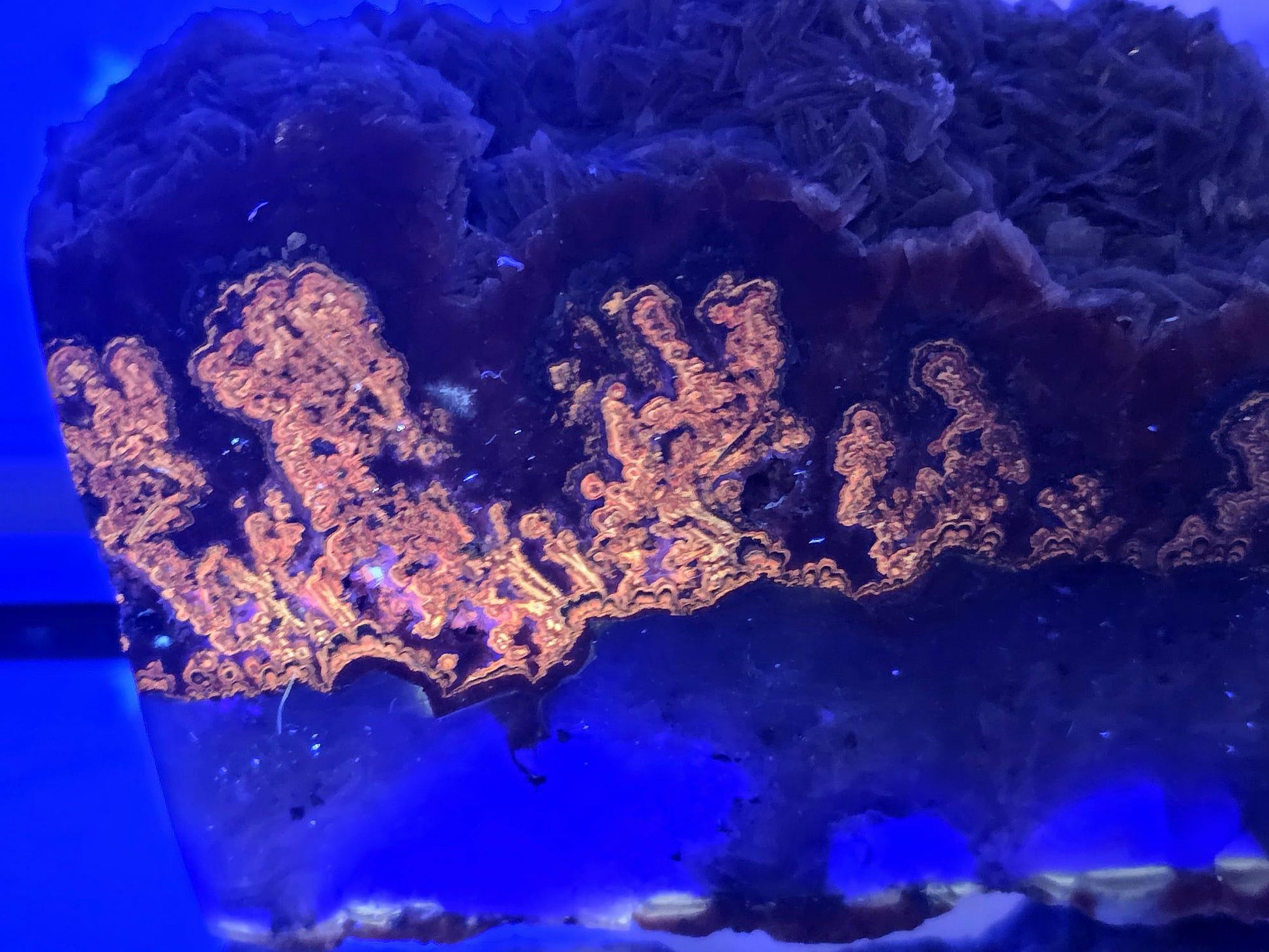 The galena—Aouli’s signature ore mineral—has partially transformed into delicate lead-oxide phases that glow warmly under UV light, hinting at traces of cerussite.