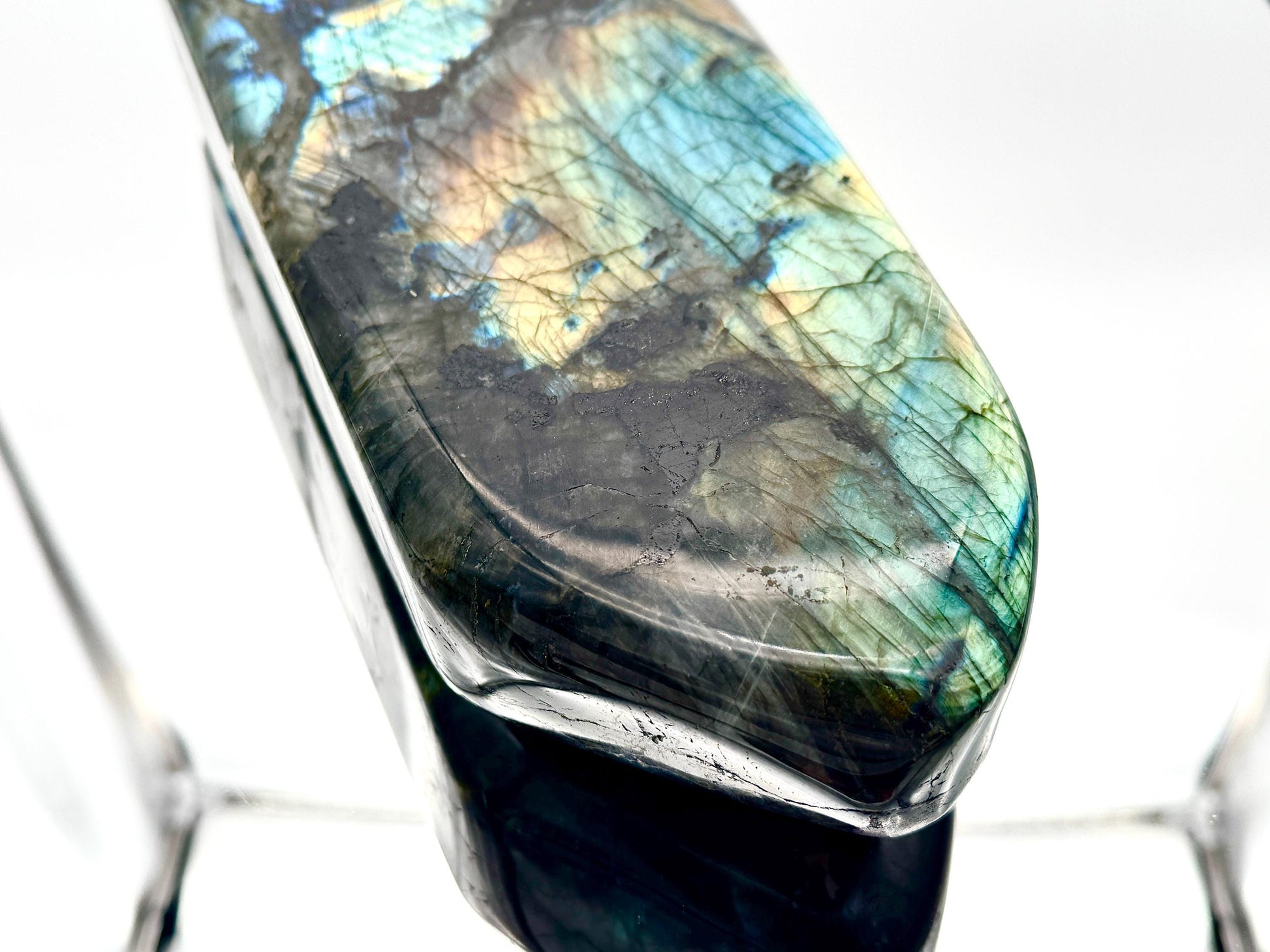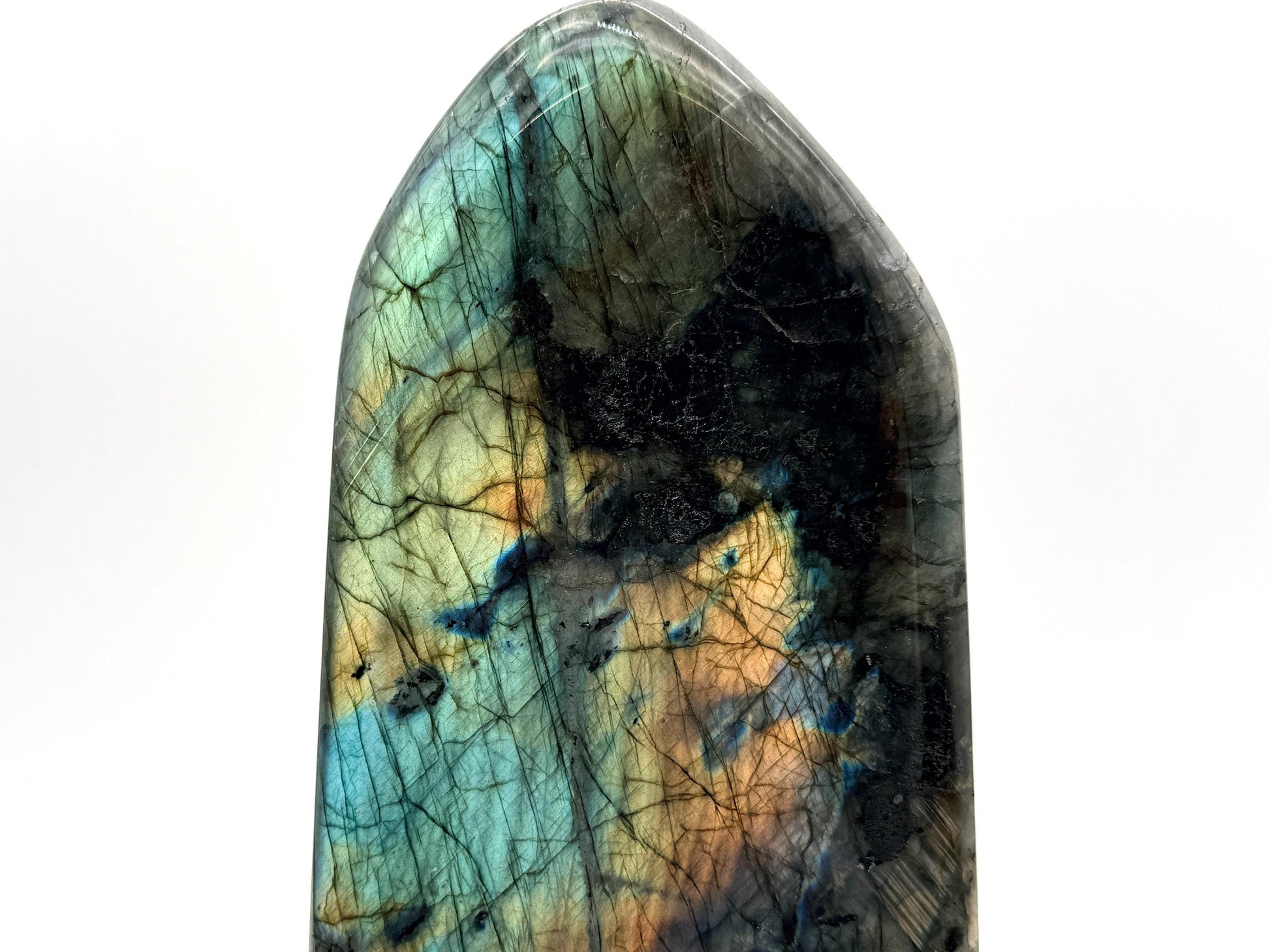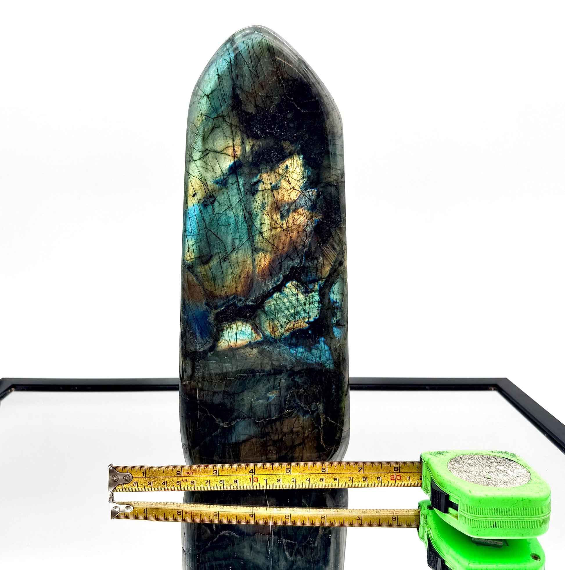 Labradorite crystal fully polished of excellent quality with strong flash Size : H 32 x 13 x 7 cm approx.Weight : 6.23kgPhotos taken at best angle to show the natural flashYou will receive the exact piece pictured