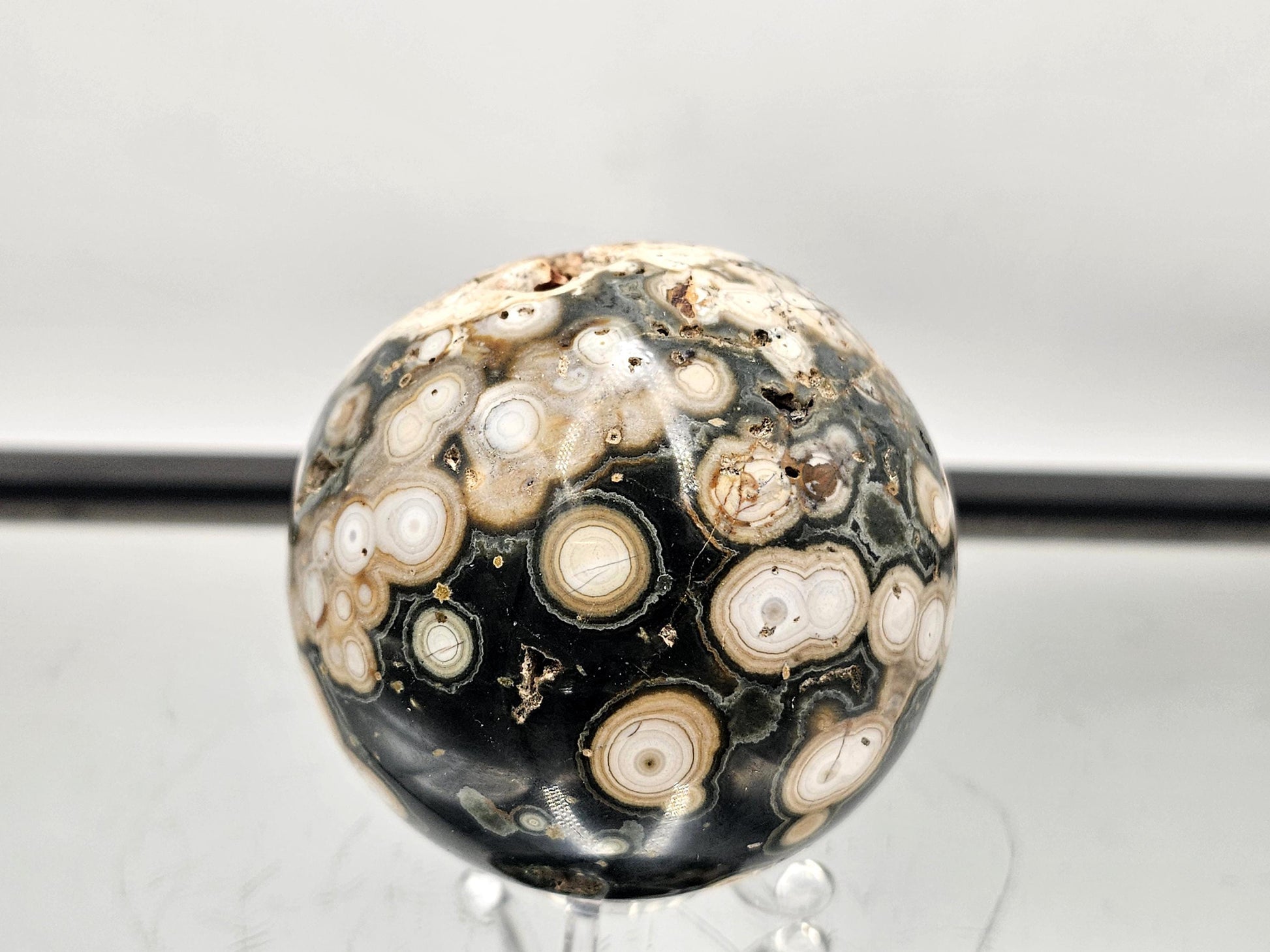 Expertly Hand Crafted from Madagascar with many natural Cavities incorporated into the spherePolished Ocean Jasper Sphere, Size : 3.3 inch Dia approxWeight : 712gOcean Jasper is a combination of chalcedony, microcrystalline quartz and other minerals, resulting in colourful bands and patterns. ... The natural banded or pattern makes these jasper gemstones a most popular stone as nearly every jasper stone is so unique and different from other jasper gemstones.You will receive the exact piece pictured.Stand will be included. Distinction ~ Excellence that sets someone or something apart from others.
