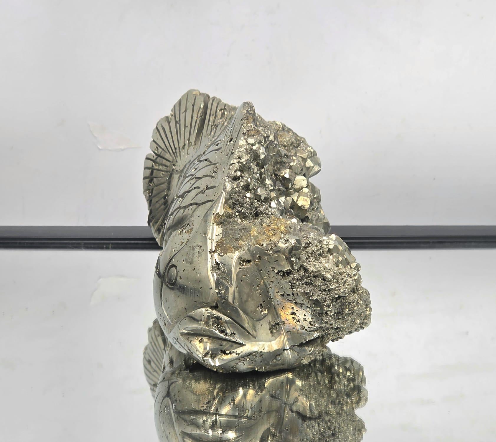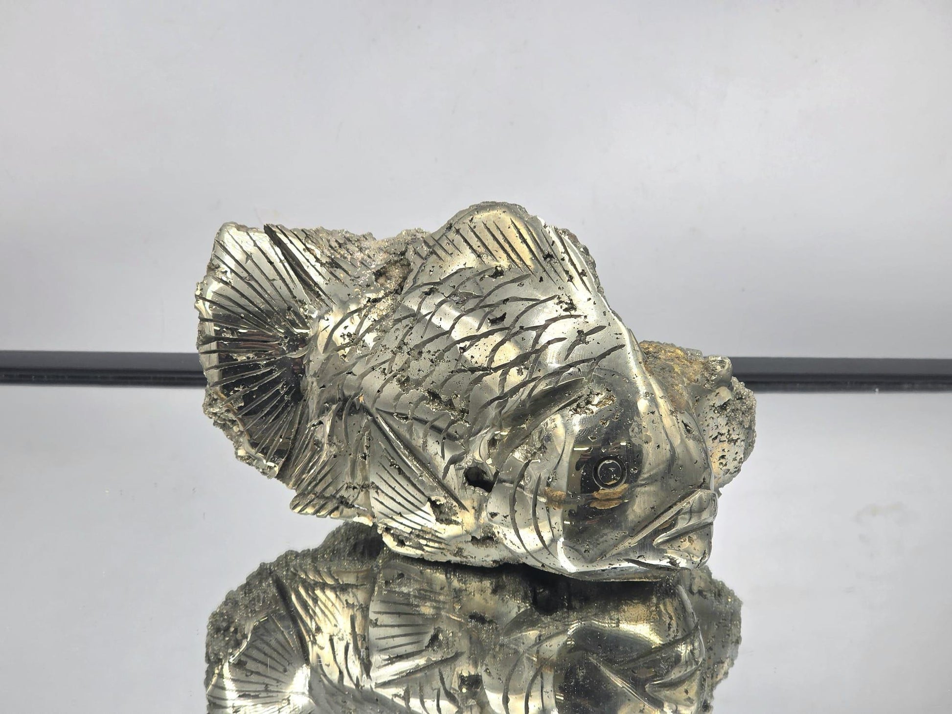 Large Pyrite Fish Crystal SculptureGraceful and radiant, the Large Pyrite Fish Sculpture flows with pyrite’s golden brilliance — a striking blend of artistry and energy.Meticulously carved to reveal lifelike detail, this shimmering piece symbolizes abundance, prosperity, and emotional flow.Pyrite’s natural metallic luster captures light from every angle, making this sculpture as eye-catching as it is energetically grounding. Whether displayed in a home or office this hand-carved fish brings both elegance and meaning to any space.Details: