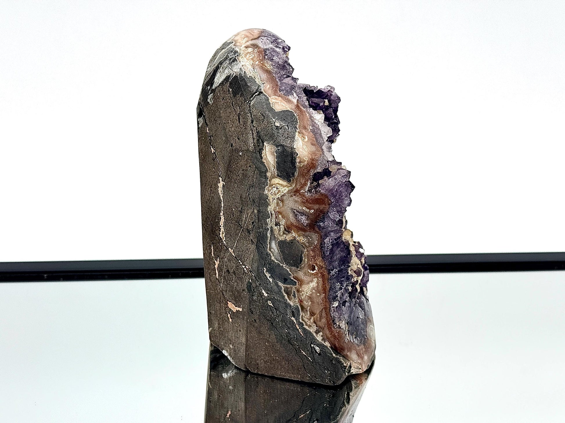 Large Natural Uruguayan Amethyst Geode Size : H 19 x 12.5 x 10 cm sizes are approx. Weight : 3.37KGThis is a Free Standing piece, the sides have been polished of excellent grade and qualityVery Large Range Of Amethyst Available