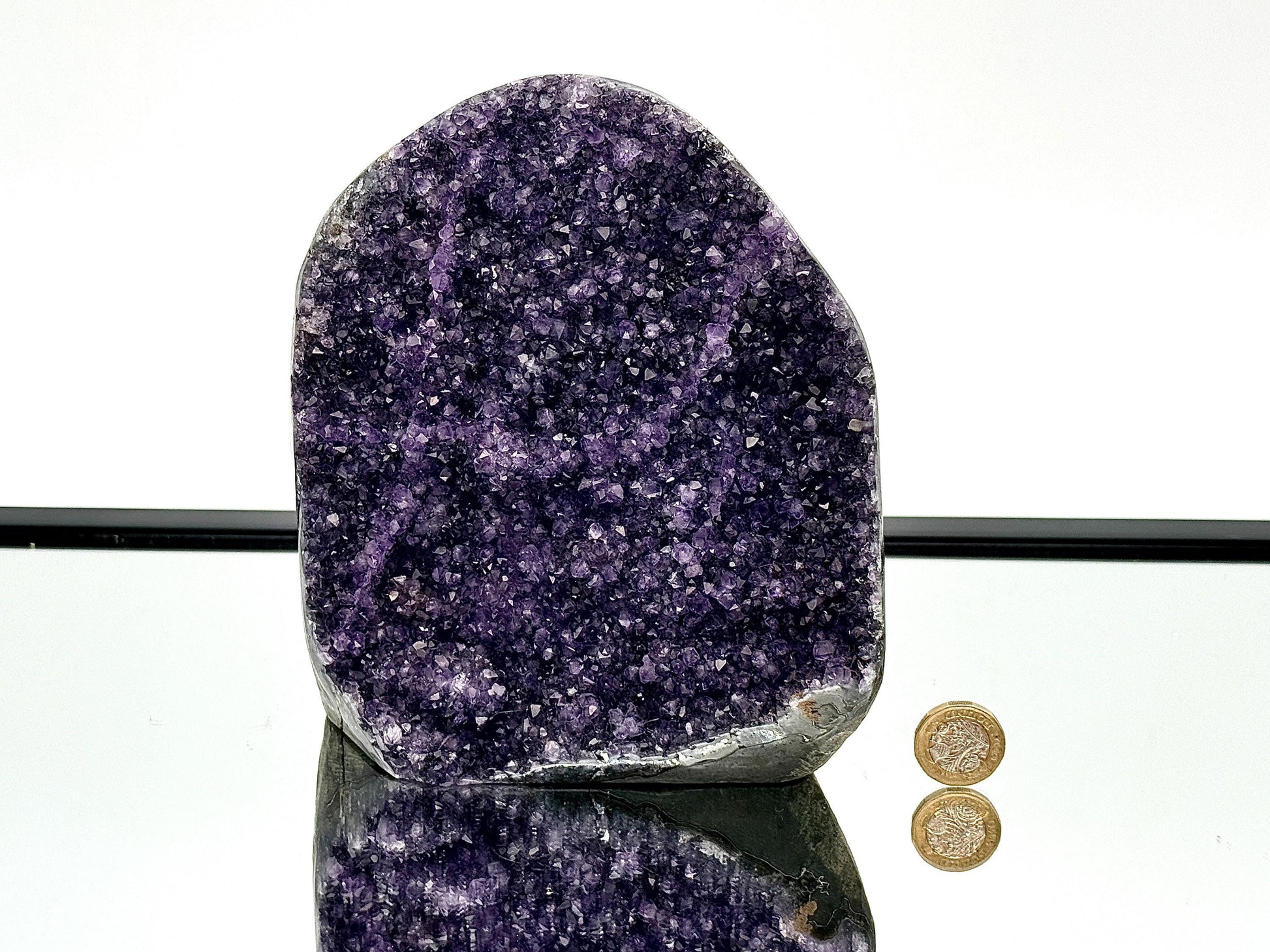 Large Natural Uruguayan Amethyst Geode Size : H 18 x 15 x 8 cm sizes are approx. Weight : 3.02KGThis is a Free Standing piece, the sides have been polished of excellent grade and qualityVery Large Range Of Amethyst Available