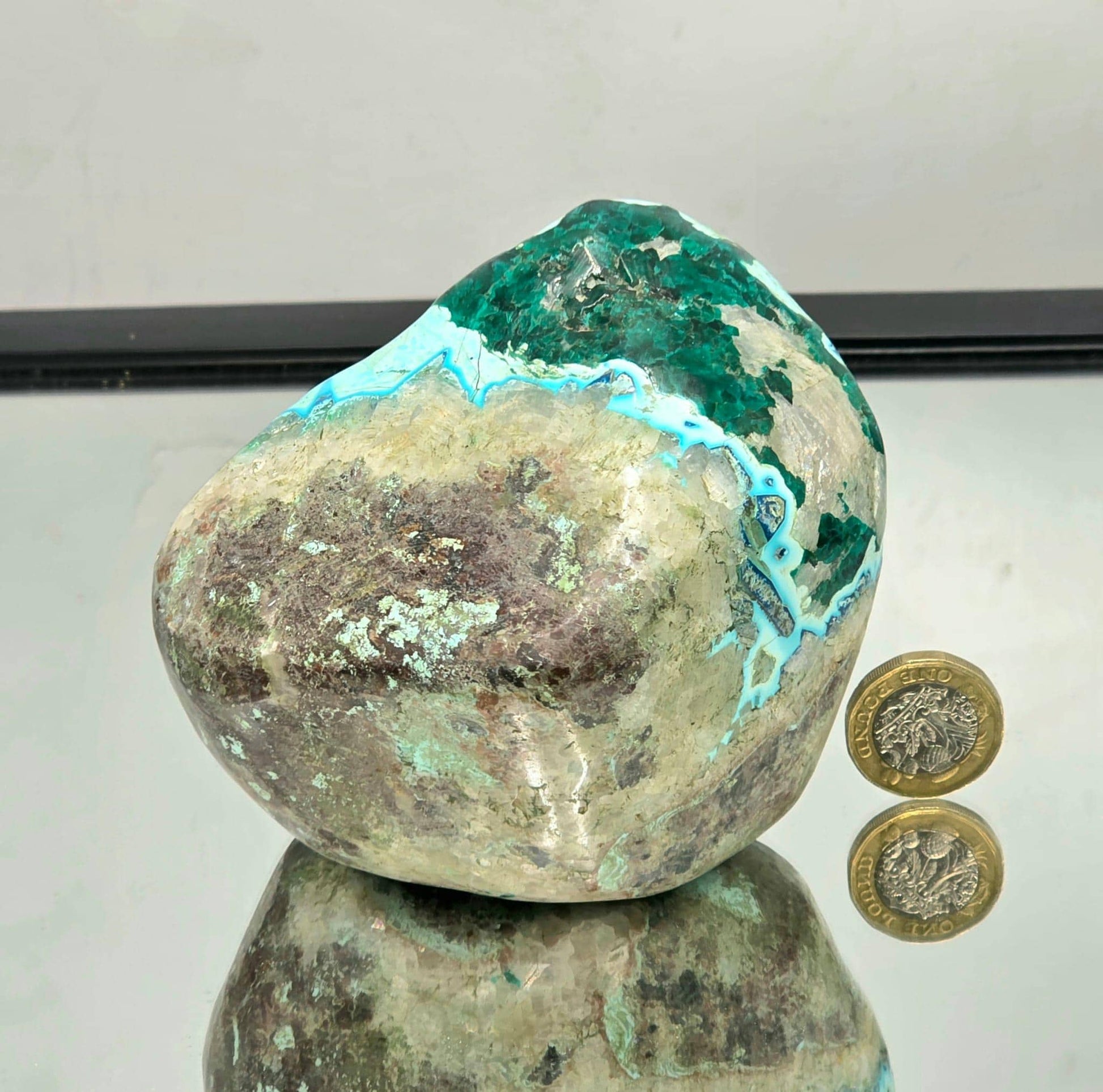 This striking large Dioptase crystal has been expertly polished to reveal the vivid emerald-green colour Dioptase is celebrated for.