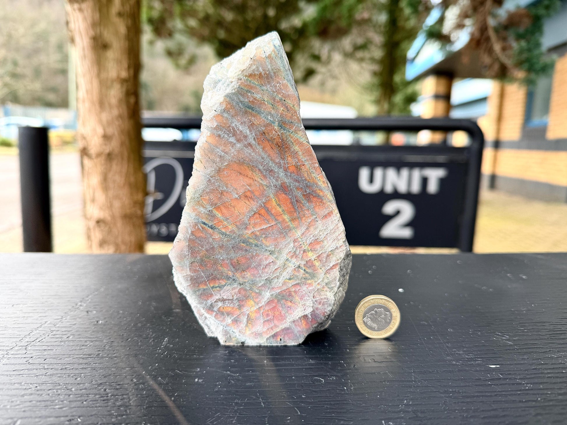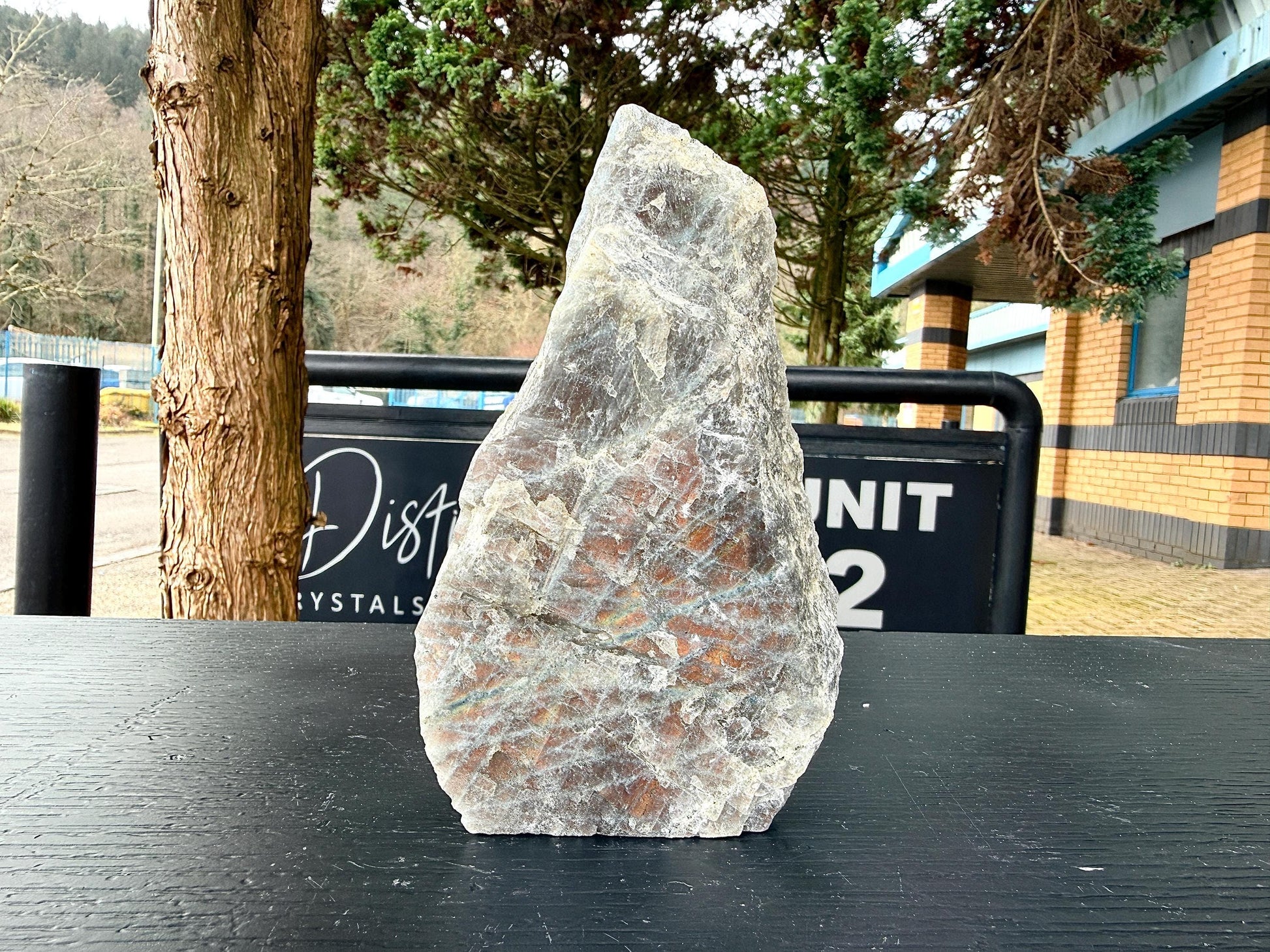 Purple Sunset Labradorite Crystal Half Polished with natural Rough back, this is a cut base free standing piece