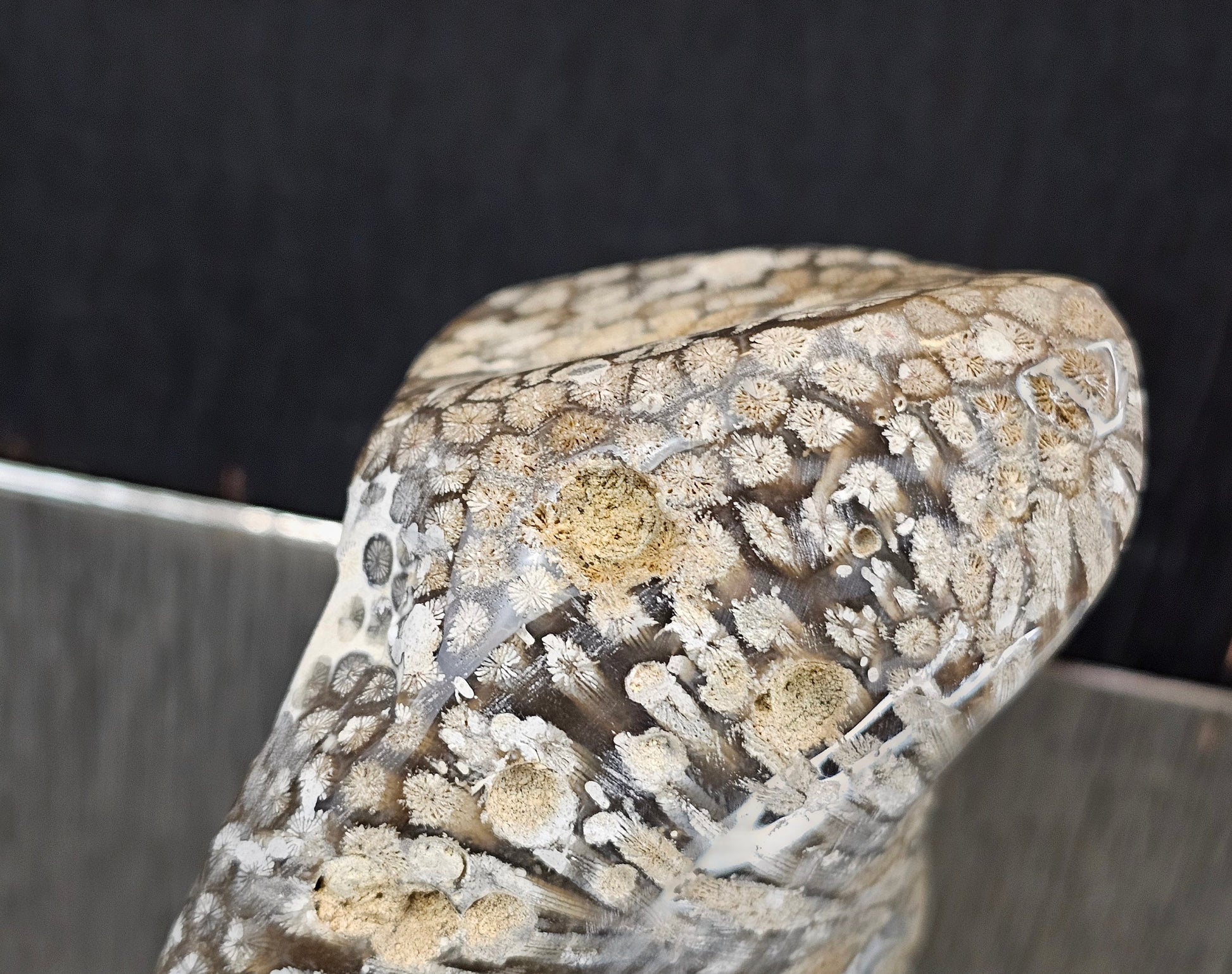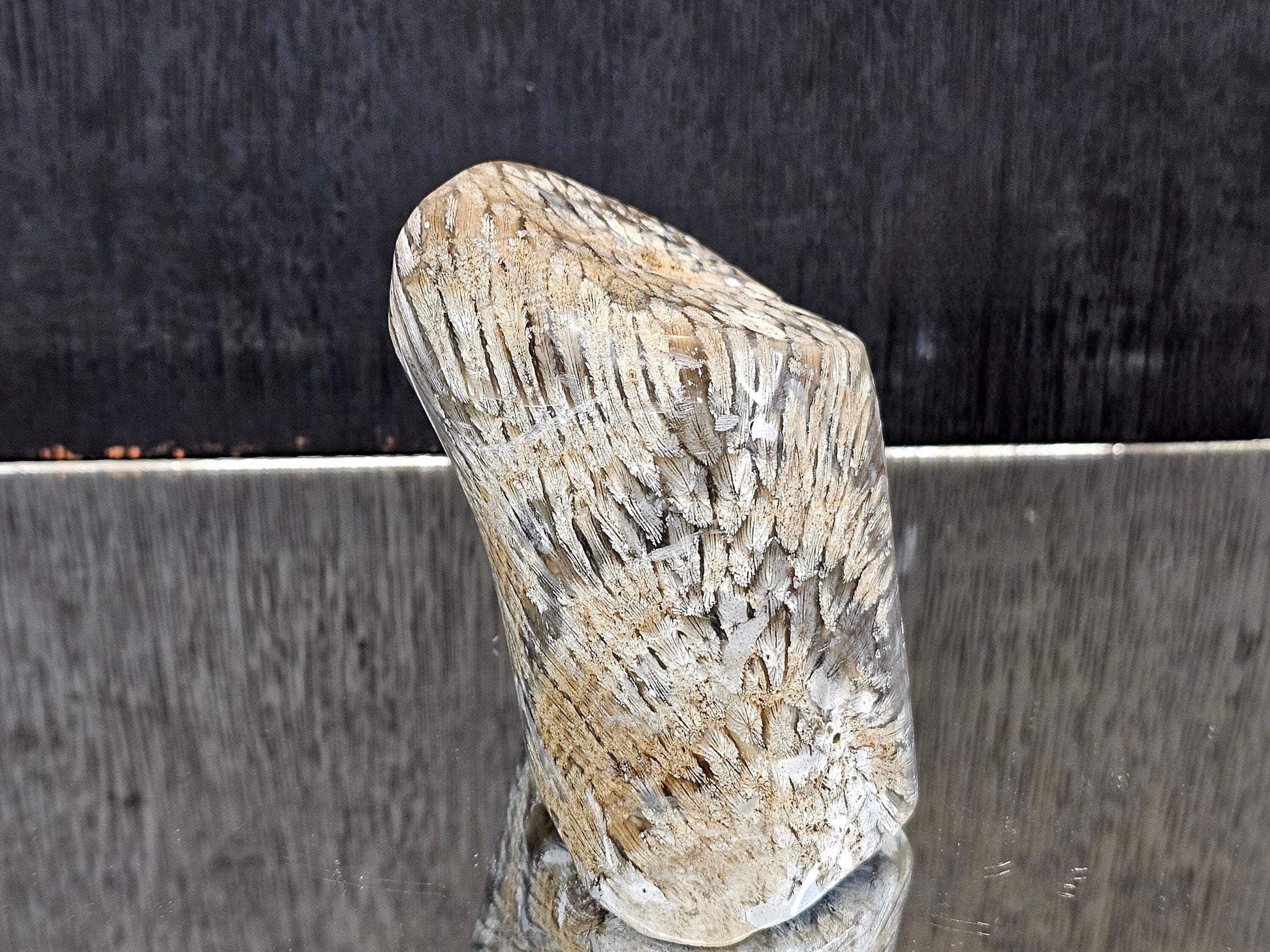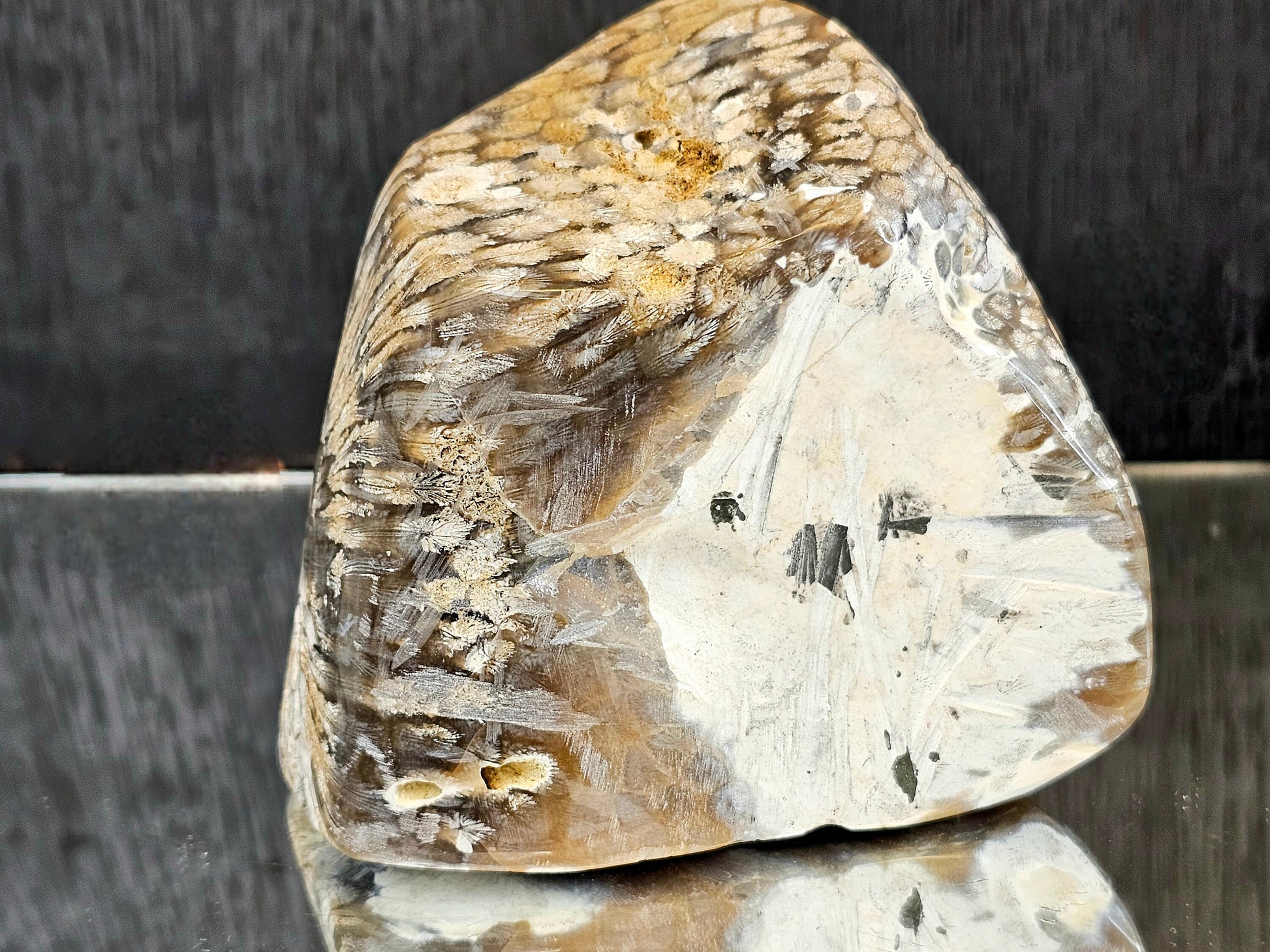 Weight: 846g you will receive the exact piece pictured. Every piece has been hand worked and polished by ourselves, revealing as much of the beautiful natural detailing as possible, such as the star detailing of the head of the Coral and also the feather detailing. This is a rare stone and the only locality known worldwide for Agatised Coral from the Jurassic Period. This is a very hard stone to work and as such it is mainly only cabochons available on the market, which have often been sent to China or India to be worked.