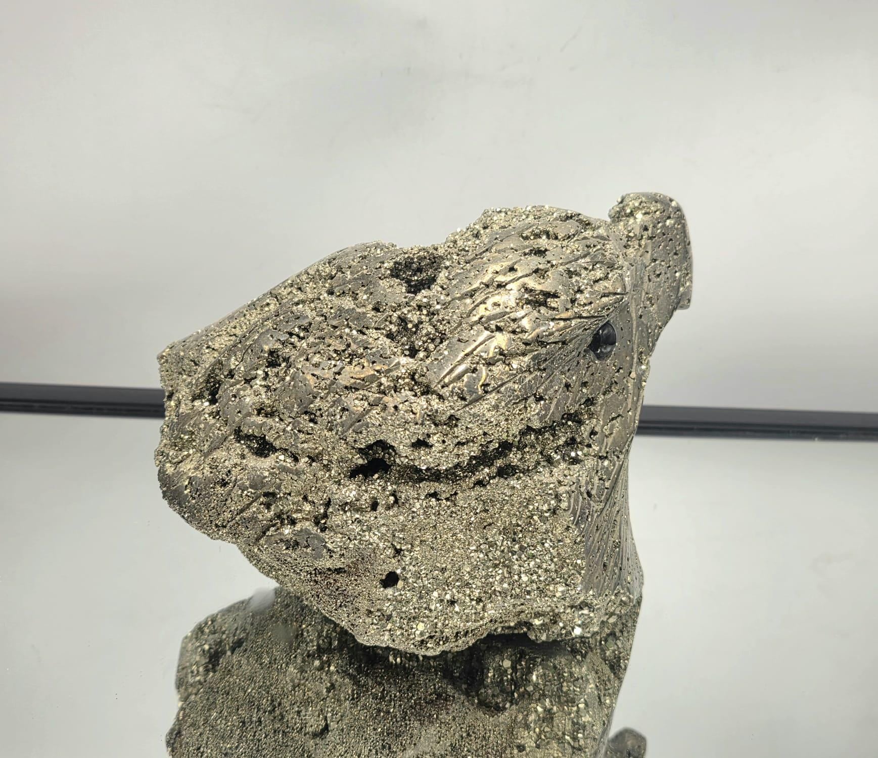 Very Large Pyrite Eagle Crystal SculptureCommanding and majestic, this Very Large Pyrite Eagle Sculpture captures the raw power and brilliance of nature in crystal form.Hand-carved from high-grade natural pyrite, the eagle, long regarded as a symbol of courage and higher perspective, is beautifully represented in this exceptional carving. Its mirror-like surface showcases pyrite’s natural sparkle, making it a breathtaking statement piece for collectors, interior stylists, or crystal enthusiasts.Details: